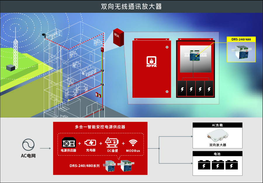 明緯自2000年投入導軌電源至今已擁有10~960W電源及相關配件模塊,產品線相當完整并在導軌式標準電源市占已名列前茅。然而隨著城市化發展,小從一棟建筑,大到整座智慧城市,歐美中各國為了提高公共安全,分別制訂了安控消防系統安全規范(EN54-4/ UL2524/ GB17945),對此,明緯新推出了240W/480W多合一數字智能安控電源供應器~DRS-240/ 480系列。