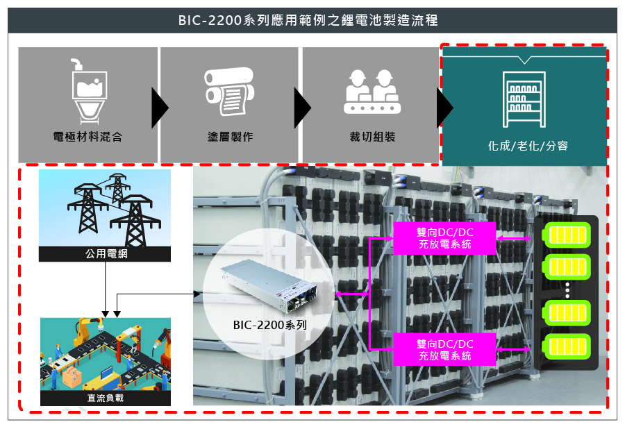 如下圖所示,電池生產(chǎn),從電極制作開始一直到出貨期間,部分制程需透過電池的充放電,以確保電池的功能與效能。所有制程中,以「化成」與「老化&分容」這兩大制程耗能最巨,其中「化成」更是影響電池質(zhì)量的關(guān)鍵制程之一。在過去,電池生產(chǎn)線需采用一臺(tái)充電器搭配一臺(tái)逆變器,方能實(shí)現(xiàn)「化成」與「分容」兩個(gè)制程。此作法不僅占據(jù)較大的空間,整體成本也無法有效下降;越多原件也意味著維護(hù)成本升高,信賴度大幅降低。
