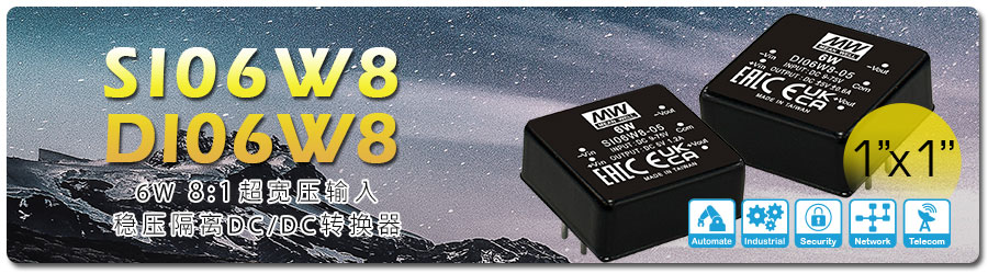 明緯繼推出 1" x 1" 6W/15W/20W/30W 4:1 寬壓輸入 DC/DC 轉換器后廣受好評,為滿足 1" x 1" 輸入范圍更寬壓的需求,新推出了 8:1 輸入 6W 的單組輸出 SI06W8 及雙組輸出 DI06W8 系列。