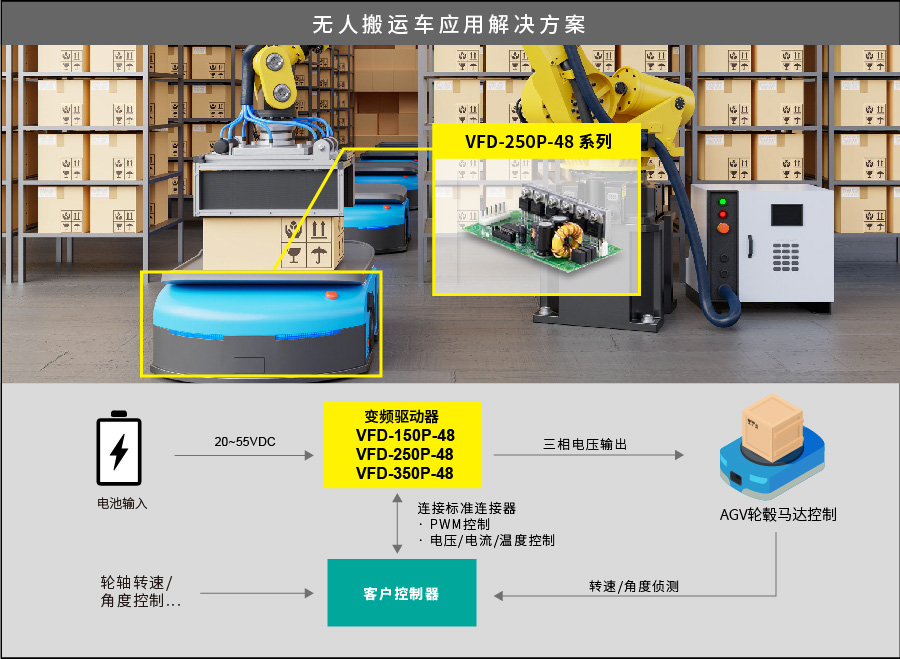全系列 VFD 驅動控制器采無風扇設計,無噪音、效率最高達 93%、并可提供 200% 峰值電流;內建完整保護功能,符合國際安規 IEC/EN61800-5-1 及電磁兼容 IEC/EN61800-3 標準。適用于具有風扇及空調、抽排煙設備、水泵、AGV、電動工具、自動門或機械設備裝置、輸送帶、醫療器材、健身器材…等采用直流無刷 BLDC 馬達的終端系統及產品。