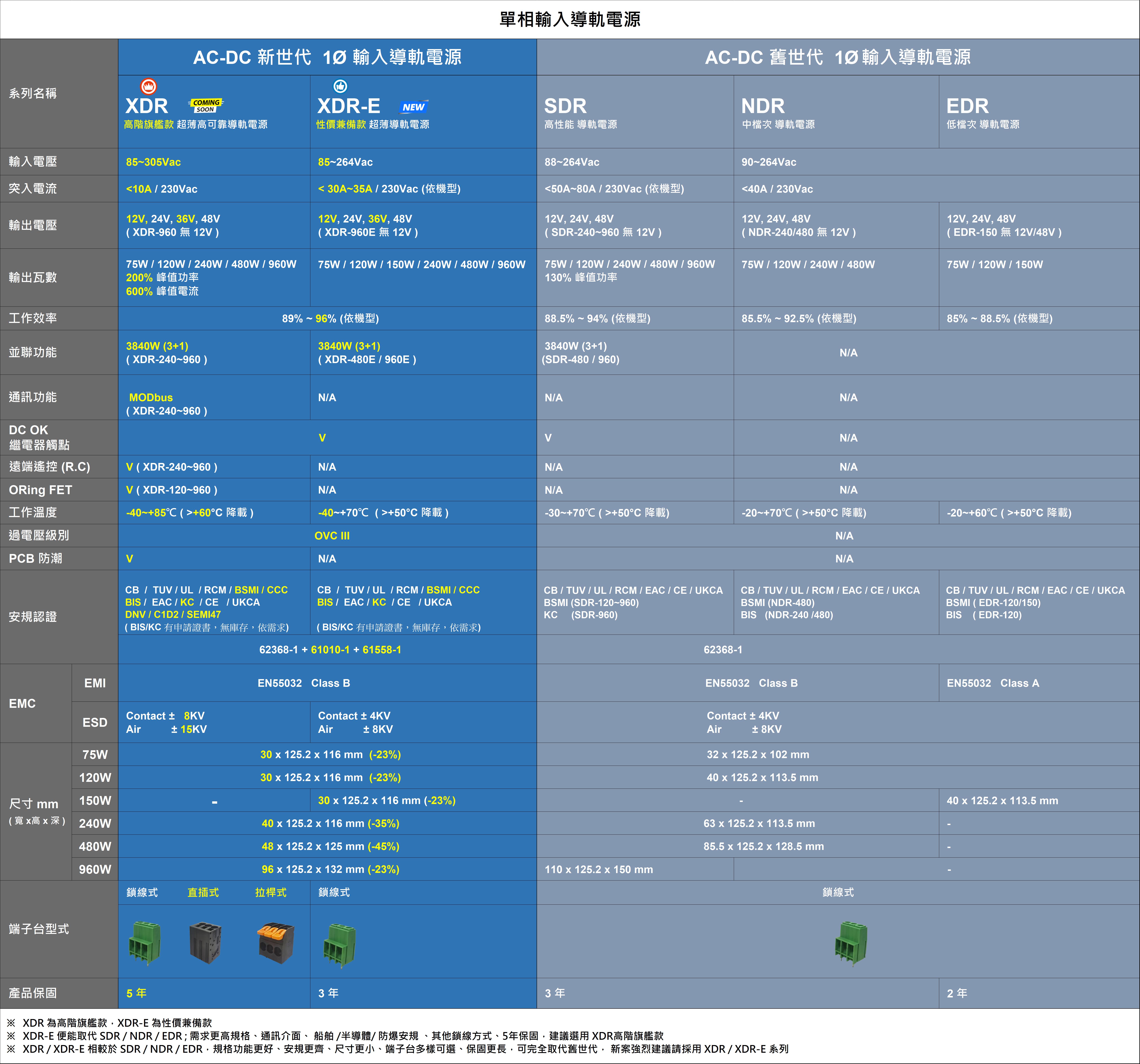 XDR-E 系列:75W~960W 全新世代 1? 輸入超薄性價兼備導軌電源