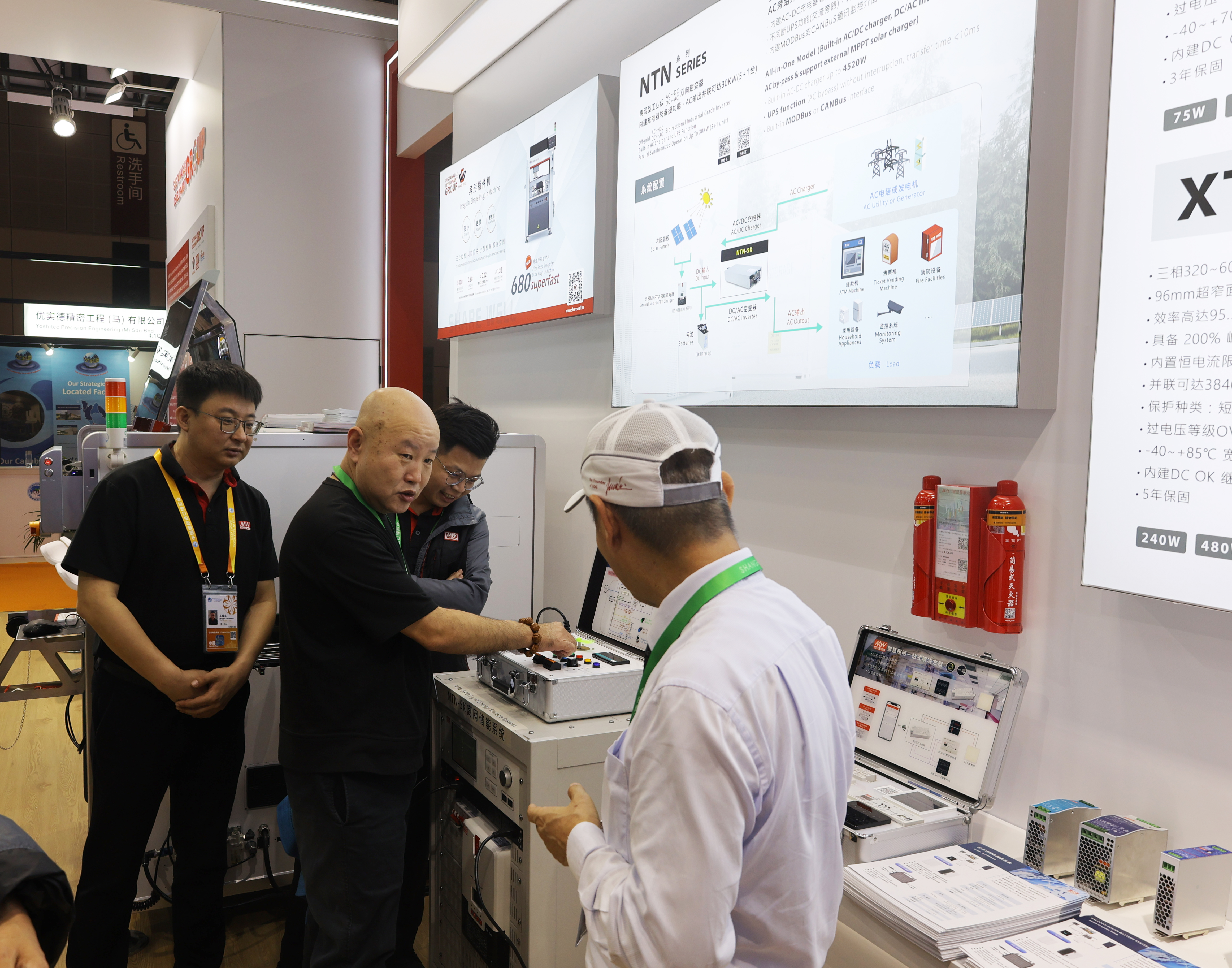 展會現場,SDG集團展示了明緯標準電源產品、明緯NTN系列與機柜式系統電源、智慧樓宇控制系統和智能化整體解決方案、移動儲能產品、協緯自動化高速異形插件機等產品。