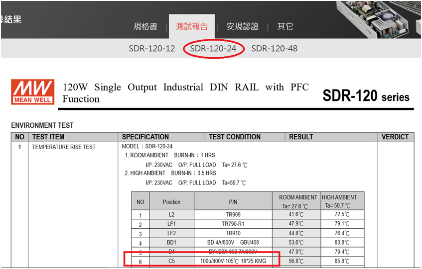 根據以下明緯官網SDR-120-24測試報告中環測測試數據得知輸入大電容容值為100μF。