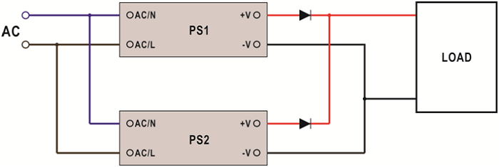 傳統冗余電源接法是由2個或多個電源于正端分別串接二極管的方式并聯輸出至電源總線上,如圖二所示。可以讓1個電源單獨工作,也可以讓多個電源同時工作。當其中1個電源出現故障時,由于二極管的單向導通特性,不會影響電源總線的輸出。