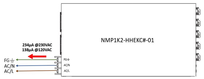 據測試結果顯示,NMP1K2-HHEKC#-01在230Vac時的漏電流為234μA,遠低于四臺MSP電源856μA的總漏電流。因此,NMP1K2-HHEKC#-01的漏電流可以滿足消費性電子設備的500μA~750μA的漏電流要求。
