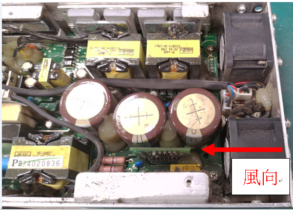 靠近風扇附近零件面對風向的迎風面也很容易卡灰塵造成散熱不足,如再吸收到空氣中的濕氣,將更容易造成零件耐壓降低或跳火而短路。