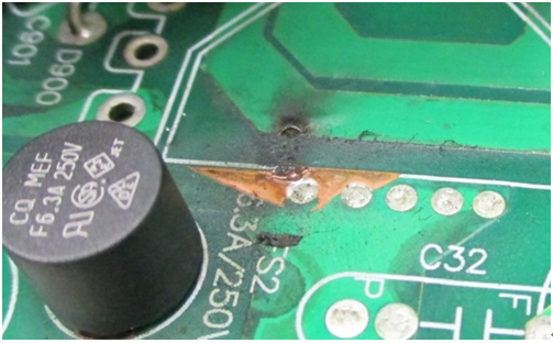 圖三、因積塵/濕氣問題導致銅箔跳火