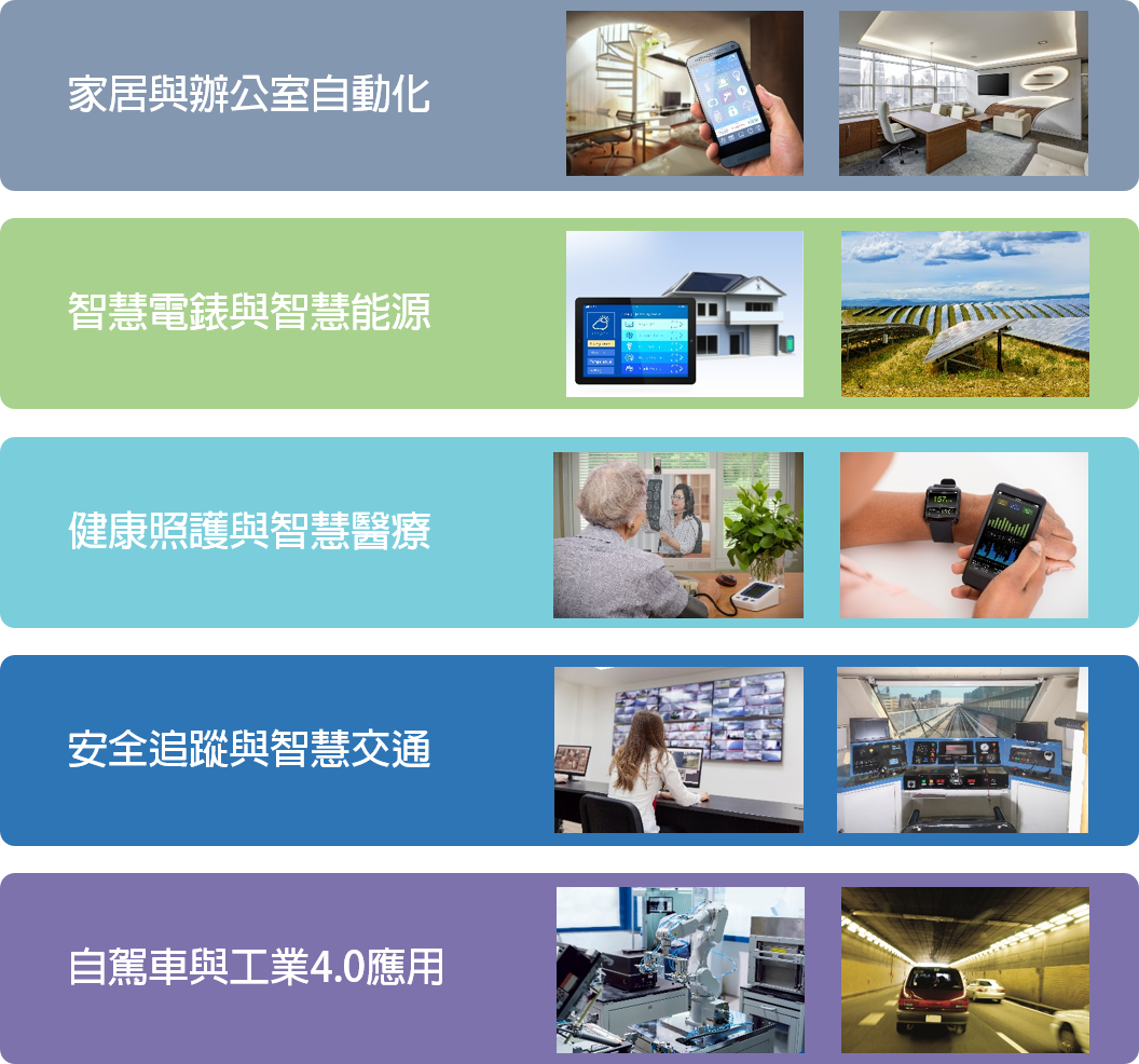 隨著5G時代的來臨,物聯網(Internet of Things)主流應用朝向家居與辦公室自動化、智能電表與智能能源、健康照護與智能醫療、安全追蹤與智慧交通以及自駕車與工業4.0應用等方面發展。