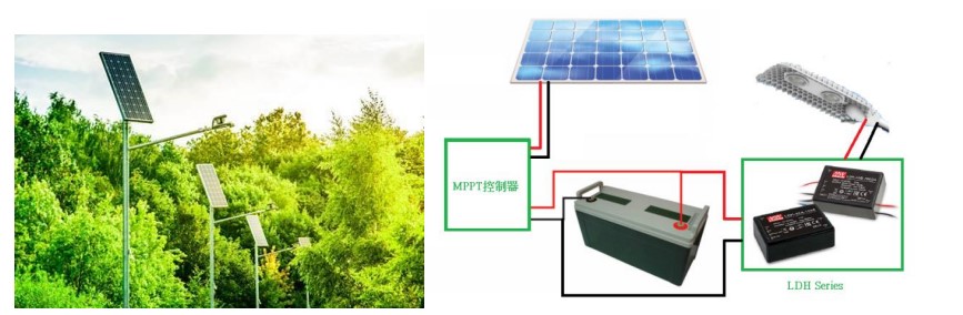 太陽能作為一種綠色環保的新能源,“取之不竭、用之不盡”。充分利用太陽能資源,對緩解常規能源緊張的情況有積極意義,且安全節能無污染,故許多中低功率路燈會改采太陽能路燈解決方案,當太陽能路燈功率需求較高時,會采用升壓式DC - DC LED驅動器,如此可以增加LED串接數并減少LED并聯數,相對降壓式減少了電流并減少損耗,提升太陽能路燈效能。如圖4所示,太陽能板于日照充足時,透過MPPT控制器對電池充電,通常為了安全考慮,所以會使用低壓電池,如12VDC或24V DC電池,如此會有較穩定的充電效能。在晚上時,電池可透過燈具內部的升壓式DC –DC LED驅動器LDH-25/45(DA)/65,將電池電壓12V或24V升壓,以提供給較高瓦數的太陽能LED路燈或移動式LED照明燈具使用,以達到綠能照明的應用。或可搭配一般汽車或船舶電池使用,搭配升壓式的LED驅動電源,做直流供電照明應用,如圖5示意。