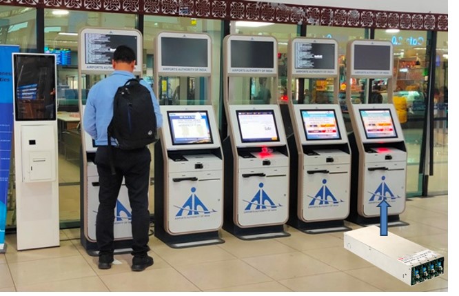 下圖為機場自助登機臺的設備,內部使用一臺模塊電源NMP650-HHEH-1,其中SLOT1/2為24Vdc并聯供電給內部搭載的計算機系統,SLOT3為12Vdc供電給觸碰屏幕與音頻系統,SLOT4為24Vdc供電給馬達。