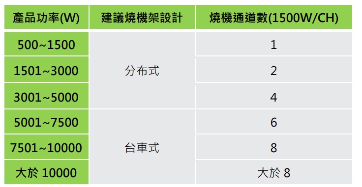 表2是根據電源產品的瓦數大小,提供合適的燒機架與ERG-5000通道數的建議。