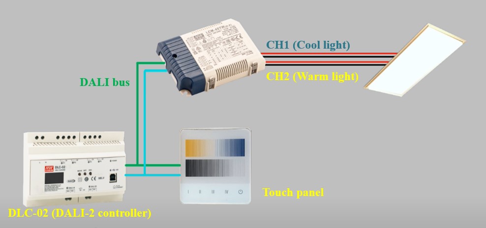 為滿足市場(chǎng)應(yīng)用需求,明緯最新推出一款符合DALI-2的LCM-40TW可調(diào)色溫和亮度的智能電源,結(jié)合明緯DLC-02 DALI-2控制器,搭配DALI-2輸入設(shè)備(如觸摸面板、存在傳感器等),為室內(nèi)智能照明系統(tǒng)提供最佳解決方案,如下圖五為DALI-2智能照明配置圖。