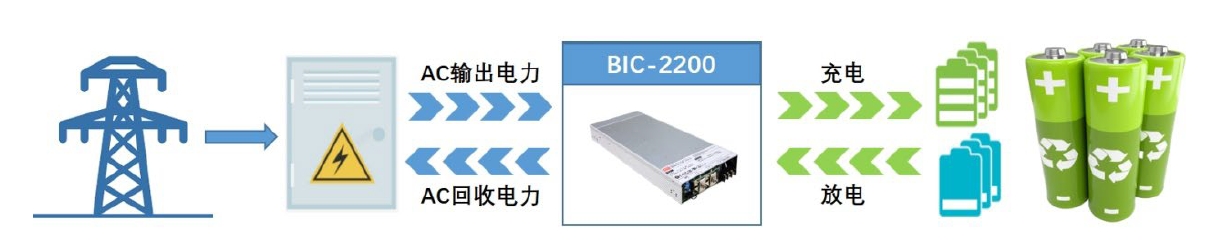 隨著“凈零碳排”目標的推進,新能源汽車、光伏等產業不斷發展,帶動鋰電池產業規模持續擴大。在鋰電池產業發展中,無論是在生產端的充放電測試,還是到家用儲能系統的備用能源,雙向電源都扮演了不可或缺的角色。明緯雙向電源 BIC-2200 系列適用于各類電池生產工廠。在電池化成與分容階段(如圖1.),使用 BIC-2200 對電池充電,同時也可將電池釋放的能量回饋至電網供其他 AC 設備使用,降低企業用電成本。