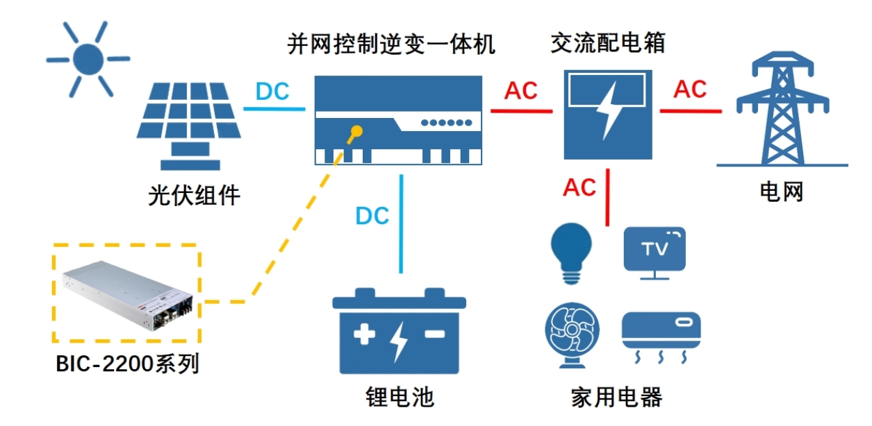 家用儲能系統(如圖2..),主要包括光伏組件、鋰電池、并網控制逆變一體機和家用電器等。在夜間把電力系統的低價電力,通過一體機內部的BIC-2200對鋰電池充電儲能;在白天電網高負荷的時候,鋰電池再經BIC-2200反向輸出能量并回饋至電力系統,不僅可以削峰填谷,減輕電網波動,還能為家庭節省電力開支。