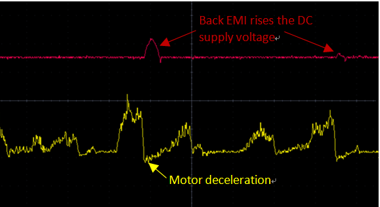 當使用直流電壓為馬達(尤其是伺服馬達)供電時,馬達在減速過程中通常會產生反電動勢。這將造成反向電流而饋回直流電源電壓,并對直流電源輸出電容器組充電。因此,在反向電流對電容器組充滿電后,直流電源電壓將觸發過電壓保護功能。圖1描述了馬達減速期間直流電源電壓的上升現象。