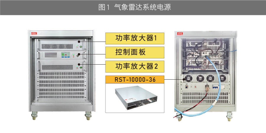 如下圖 1 為氣象雷達系統電源應用,負載為射頻功率放大器。使用明緯 RST-10000-36 + 15U 機柜,組合成一套完整氣象雷達系統電源,采用模擬警報訊號,以監控電源工作狀態。