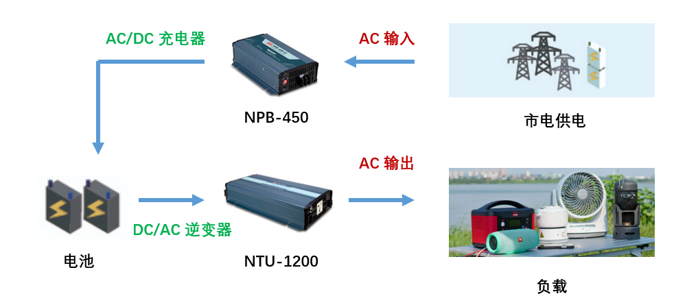 明緯推出 NPB 系列智能充電器與 NTS/NTU 系列高效能逆變器可搭配客戶端電池系統應用,不僅可以解決各種無 AC 電場所的電力供應問題,也可以作為以電池為基礎的 UPS 備用電源,提升整體系統工作的穩定性。下圖展示了一個基本的移動儲能應用配置。