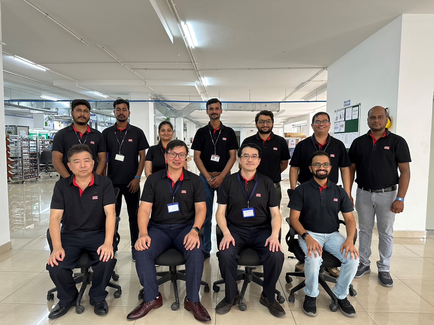 明緯集團(tuán)海外區(qū) 鄭志得執(zhí)行長(zhǎng)(前排右二)與亞澳區(qū) 吳政道協(xié)理(前排左二)帶領(lǐng)明緯印度團(tuán)隊(duì)持續(xù)深耕當(dāng)?shù)厥袌?chǎng)。