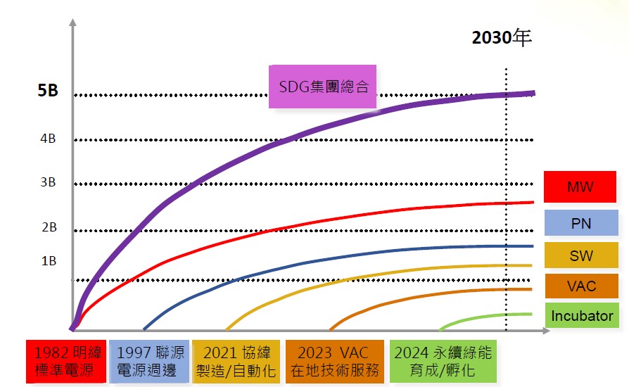 2020年12月12日,明緯第一本專書「信賴伙伴的力量」新書發表會上,SDG集團創辦人林國棟先生首度公開提出成立「SDG集團」的想法,SDG集團由經歷近40年耕耘的明緯集團為基礎,并以明緯公益基金會作為價值核心,發展第二品牌聯源集團,投資外部合作伙伴并輔導成為 ESG 企業,作為明緯集團經銷商販賣上下游產業產品,以進出口貿易型態,整合資源取得最佳性價比商品,透過全球通路與分公司銷售 ;協緯集團則著重中國地區發展,各子公司間互相支持產生綜效,并以蘇州智能園區為基地,負責生產與制造高性價比標準產品,提供SDG 集團內部企業與伙伴使用或外部銷售為主 。